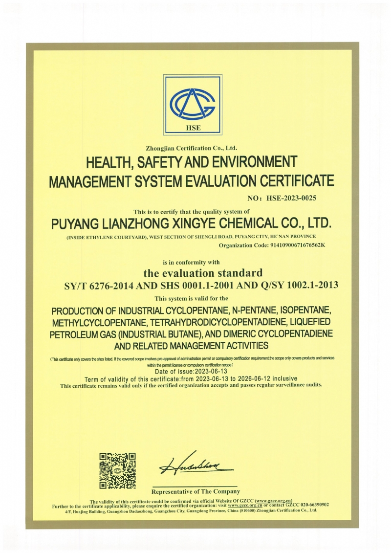 HEALTH, SAFETY AND ENVIRONMENT MANAGEMENT SYSTEM EVALUATION CERTIFICATE